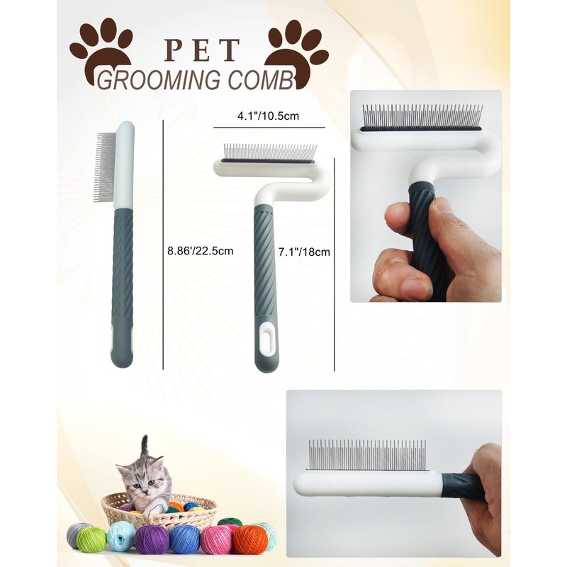 - TWO DIFFERENT SHAPES:There are two different shapes of pet grooming comb that can be used together to achieve better combing results. One type is a simple straight comb, suitable for finely combing various parts of pets, such as combing the pet's beard, ears, and hair on the legs. Another type is a comb shaped like a T, which is more suitable for combing the hair on the back and belly of pets over a large area.