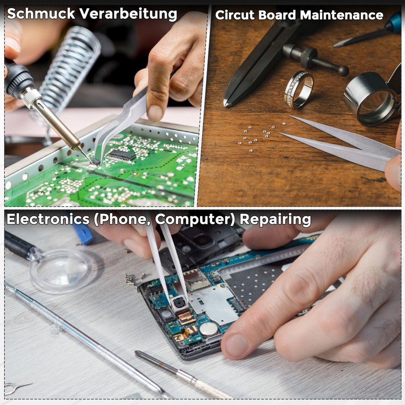 - Multi-function tweezers set: 5 kinds of tweezers with different heads are suitable for amateur crafts, Soldering, jewelry, nail stickers, paper carving, embroidery, modeling, mobile phone repair, watch repair, Relief, diamond, glasses, instruments, etc. Meet various needs to a great extent.