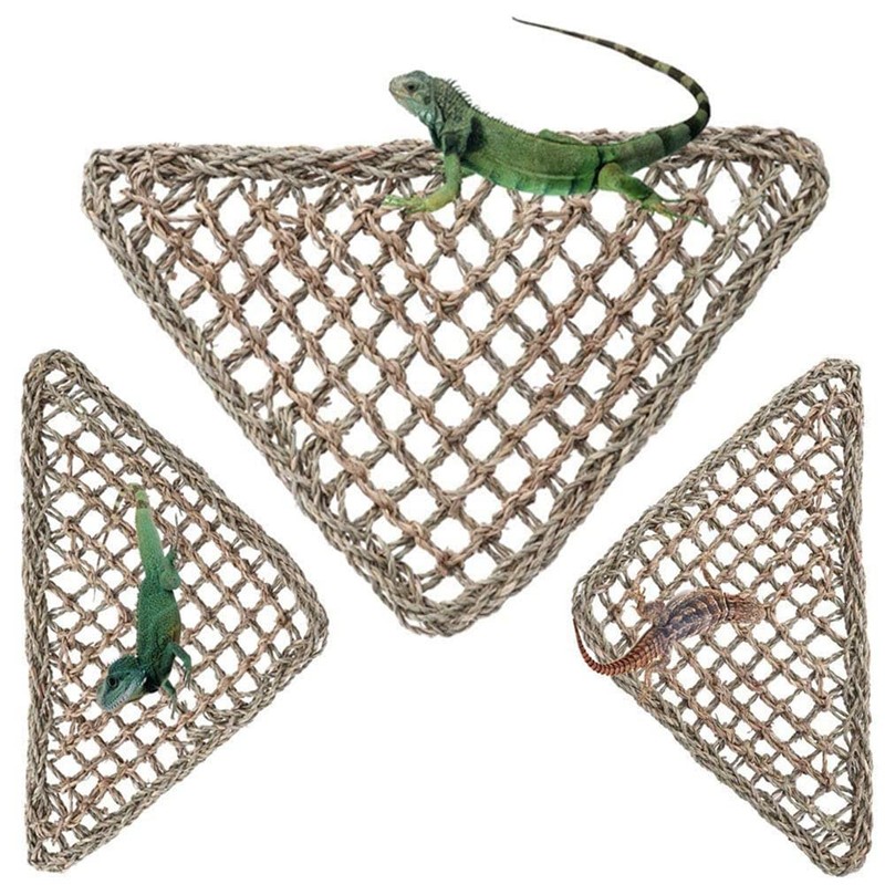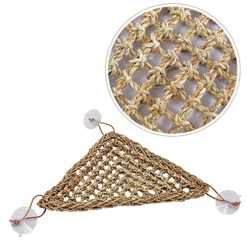 • Straw hand-woven, soft but very sturdy material.Comes with strong suction cups and rope to fix the reptile hammock to the tank.