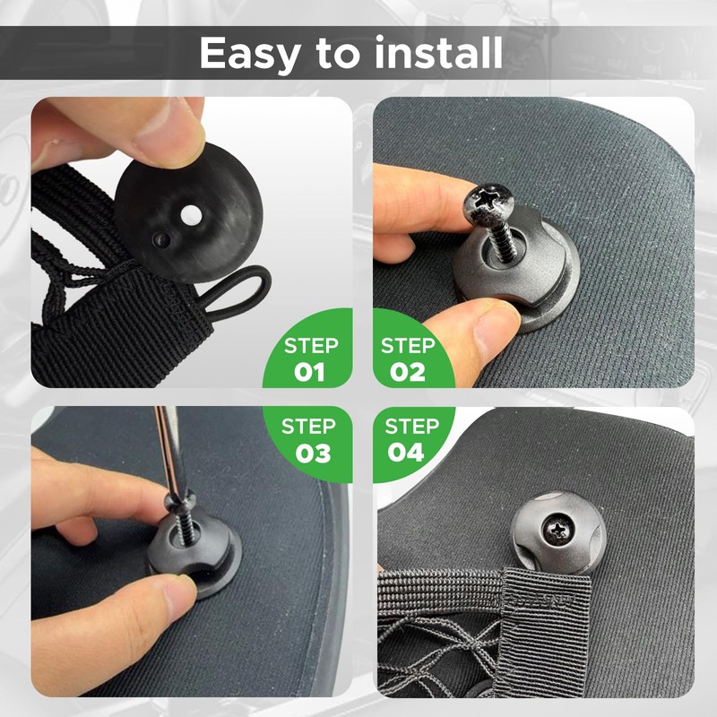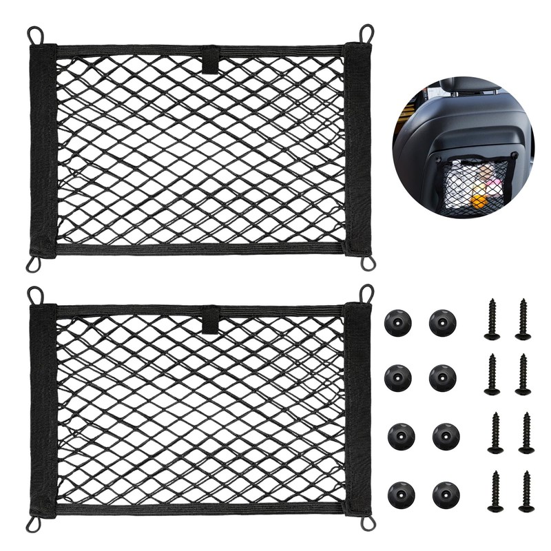• - Complete Package: Each set includes 2 black elastic cargo nets, 8 round fixers, and 8 screws, with dimensions of 13.78 × 9.84in. Stretching to 20×13.7in, providing ample space for your belongings.