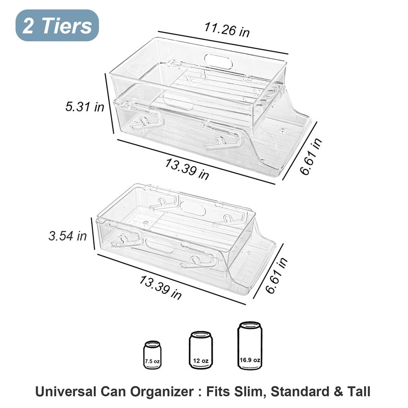 - Slide and Fold Design: Folded height: 3.5" | Expanded height: 5.3" – The tier height is adjustable and can be expanded from 1 tier to 2 tiers to hold more cans, suitable for use in the vertical space of the refrigerator
