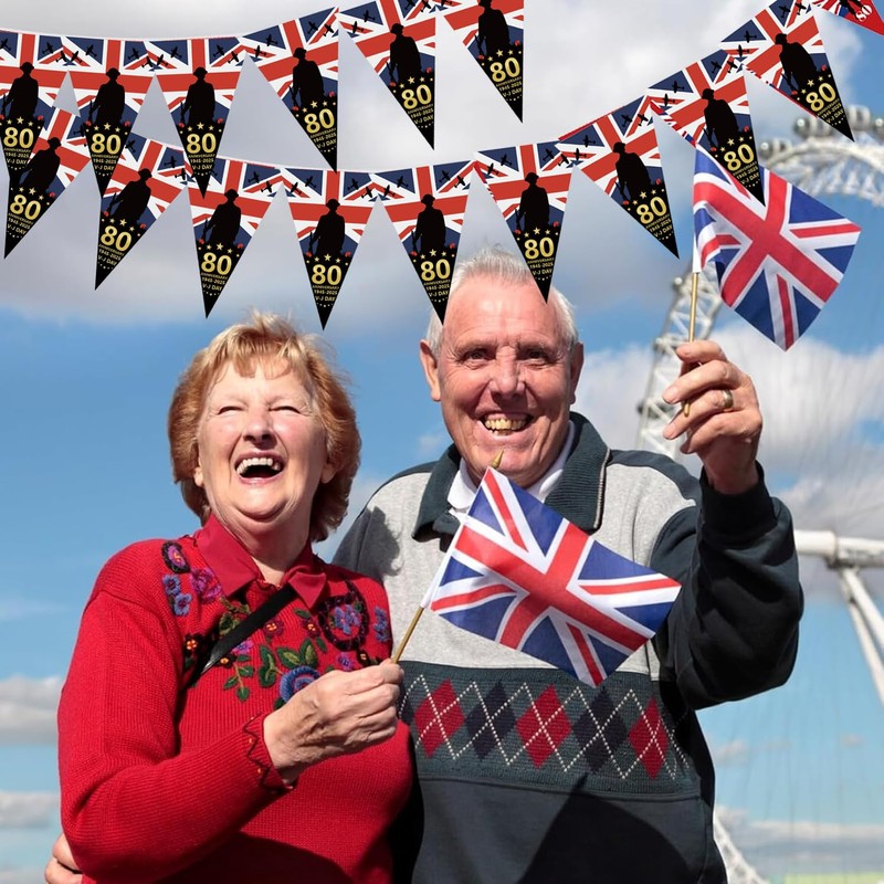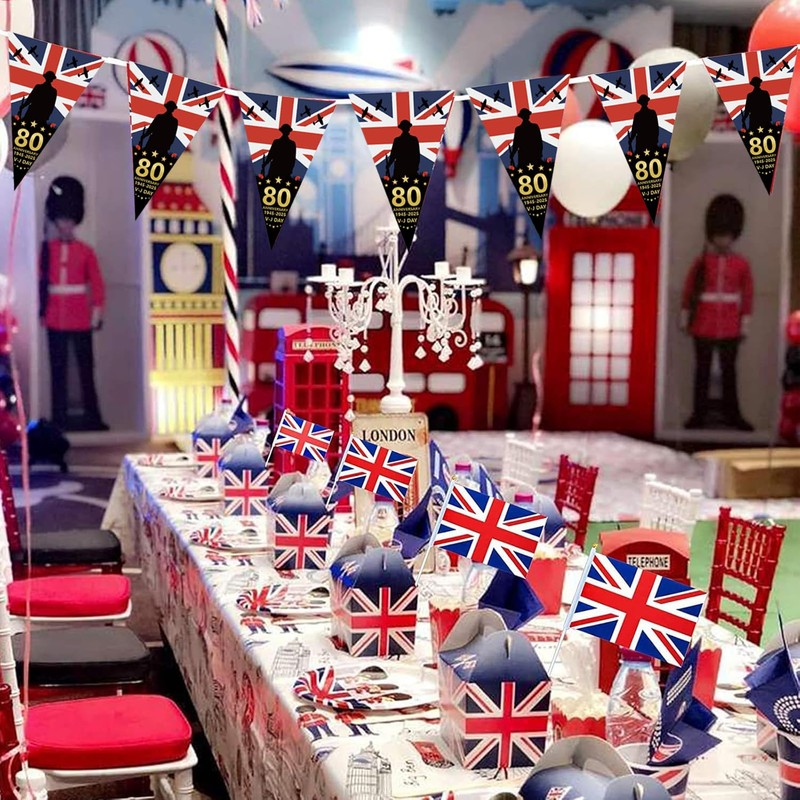 2 Pcs VJ Day 80th Anniversary Bunting, VJ-Day 80th Anniversary Decorations, Union Jack Flags Total 40Pcs Flag-14 x 21 cm, 20 Pcs One String