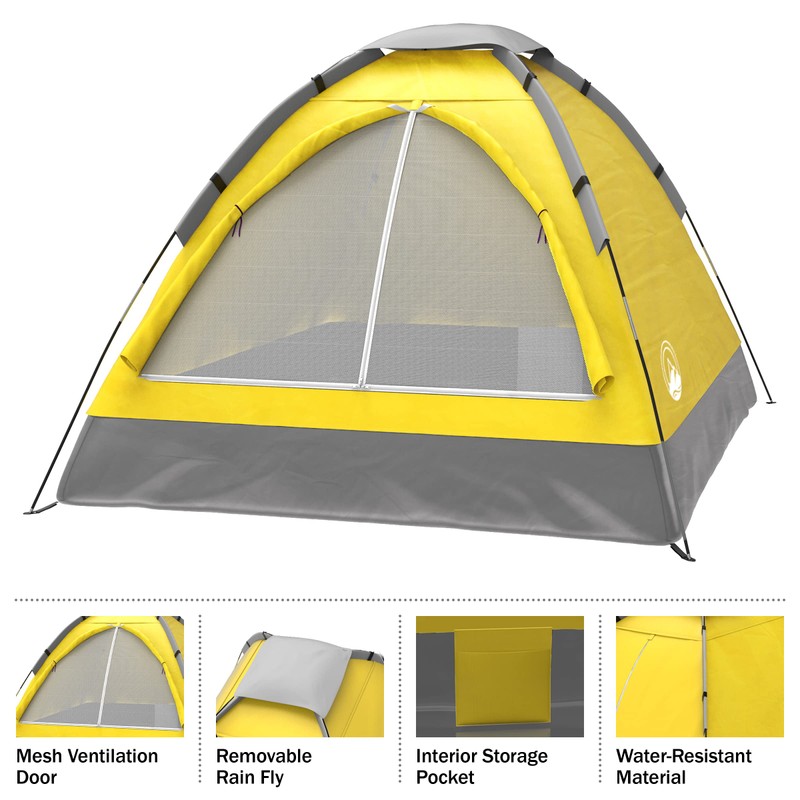 2-Person Tent with Removable Rain Fly and Carry Bag – Comes with Camping Lantern with Fan – Weather-Resistant Camping Accessories by Wakeman, Yellow, 85 x 60