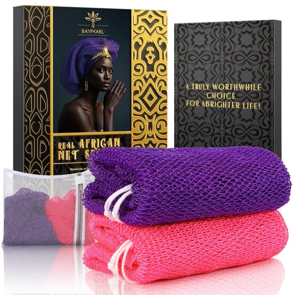 Baypearl 2-Piece African Net Sponge - Real Bath & Body Scrubber for Shower, Deep Cleansing for Sensitive Skin, Gentle Yet Effective for Dry/Acne Skin, Reusable Loofah Alternative (Pink & Purple)