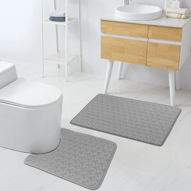 2 Piece Bathroom Rug Set Non Slip, PVC Backing Grey Memory Foam Bath Mat Set, Water Absorbing Bathmat Bathrug Set for Elderly, Kids, Quick Dry Gray Bathroom Mats Set Non Skid, 36" x 24" Plus 17" x 24"