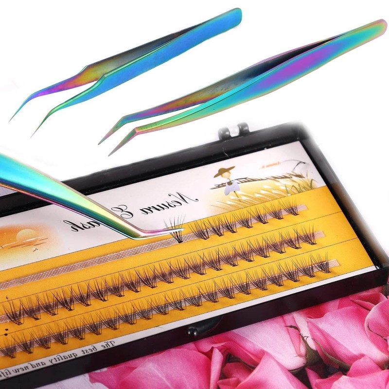 2-Piece Professional Lash Tool Set - Rainbow Stainless Steel Tweezers for Volume/Classic/Isolation Lashes, Multi-Function Angled Design (Precision Grip, Salon Quality)