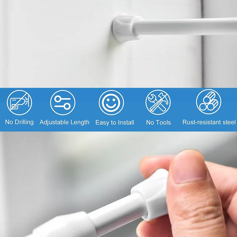 - Multi-functional: No need to drill holes, relies directly on pressure support, just pull and twist, extend the length to stuck between the openings, Can be used indoors and outdoors.