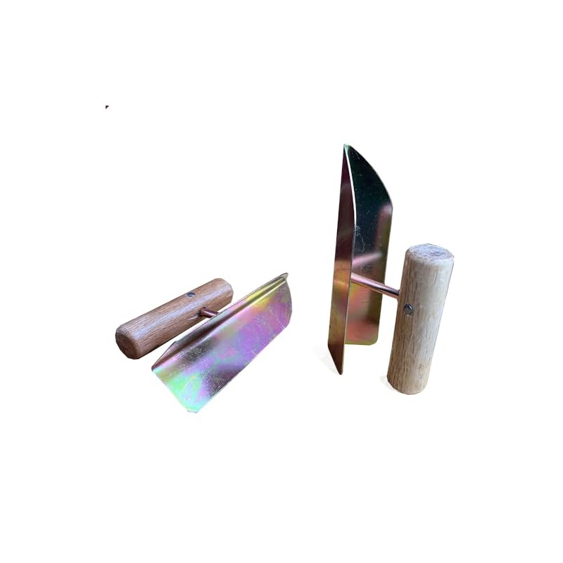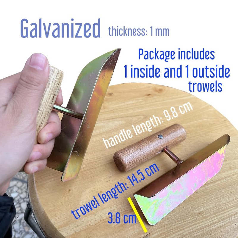 these are 1 piece inside and 1 piece outside drywall corner trowel with wooden handle, made of metal, blade surface galvanized, well constructed and easy to use. Great for some concrete work around the house