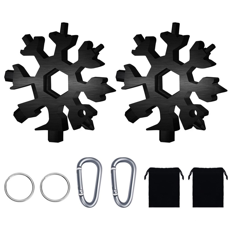 2 Pieces 18-in-1 Snowflake Multi-Tool with Carabiner and Key Ring, Gifts for Men, Stainless Steel Portable Snowflakes Multifunctional Tool for Outdoor Adventure Camping (Black)