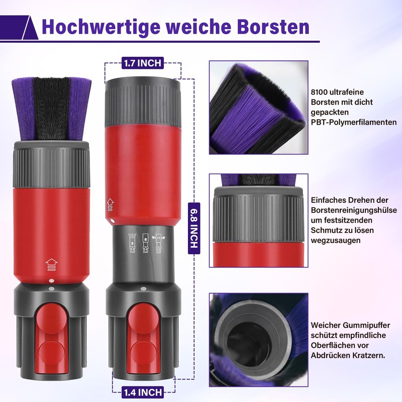 - ✅【EASY TO INSTALL AND USE】 Non-scratch brush for Dyson Kit, with dust-free dusting brush easily attaches to your vacuum cleaner to ensure effortless cleaning. The super soft dusting brush has a rotating mouth. With a simple twist, you can pull it out to remove dust and dirt from the bristles.