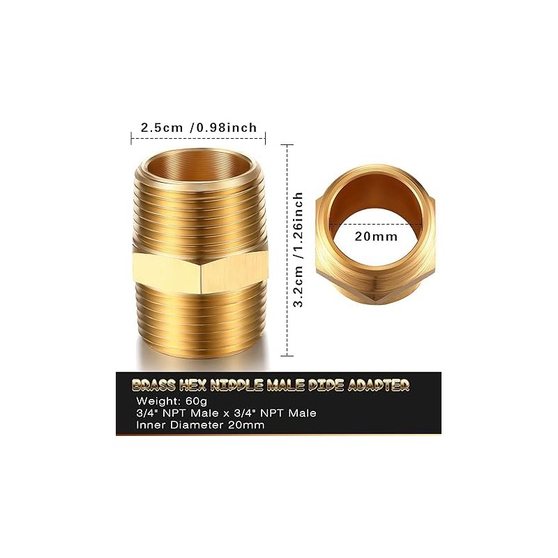 2 Pieces Brass Pipe Fitting 3/4 x 3/4 Inch NPT Brass Hex Nipple Male Pipe Adapter, Straight Connector Fitting