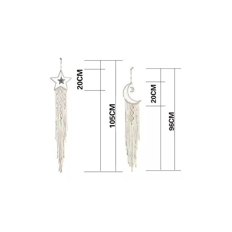 [Tamaño y material] Tamaño de la estrella: diámetro: 20 cm, longitud total 105 cm. Tamaño de la luna: diámetro: 20 cm, longitud total: 96 cm; este colgante de pared de macramé está totalmente hecho a mano. Colgante 100% algodón, medio círculo metálico, perla elegante y brillante luna.