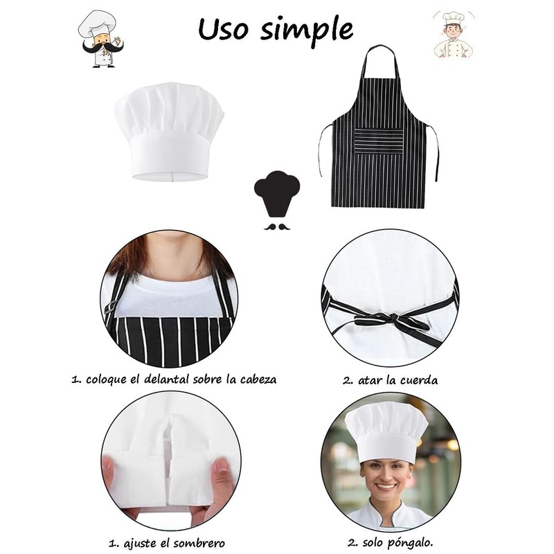 - 【Fácil de limpiar】: Gorro Chef y Mandil Chef se pueden lavar a máquina o a mano y reutilizar, y se pueden almacenar en un lugar seco para que se sequen después del lavado, por lo que no se encogerán y se pueden usar con confianza