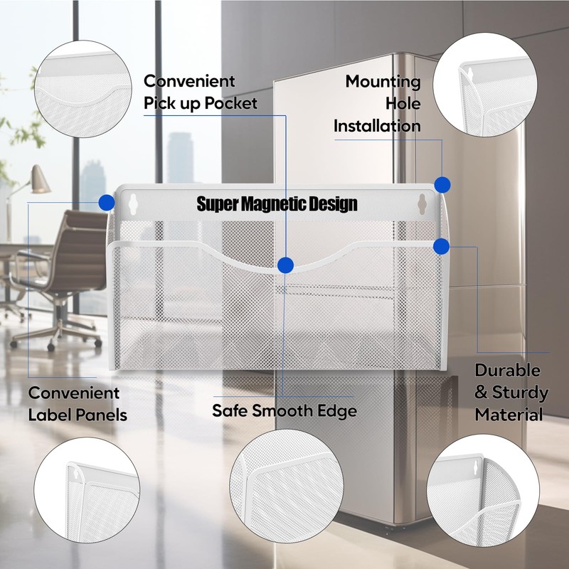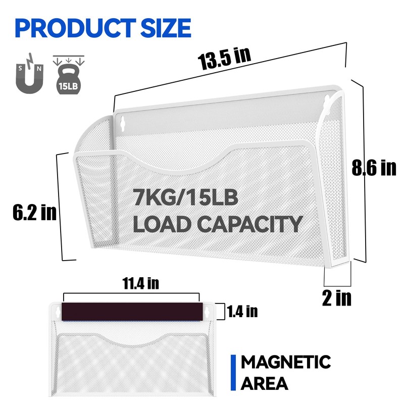 - 【Multipurpose】 Wall File Organizer Dimensions - 13.5*3*8.6 inchs/34.5*8*22 cm. Magnetic Mesh File Folder can also be used as a magnetic file storage, a magnetic file holder for refrigerator, a magnetic folder bins, magnetic wall file, a magnetic letter file pocket or a mail holder magnetic for fridge. Perfect for every office to keep your documents and files neat and tidy.