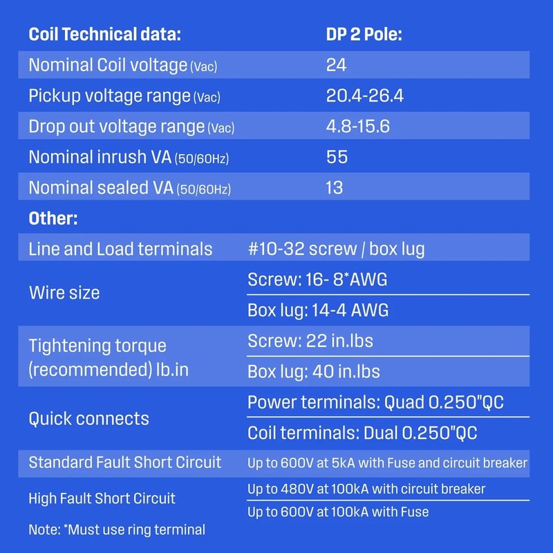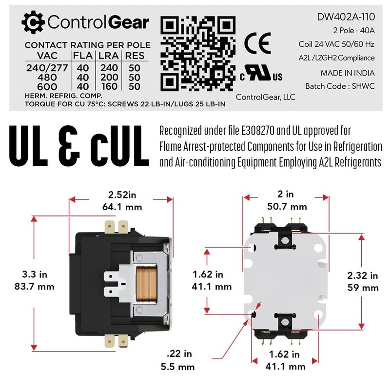 2 Pole, 40 Amp, 24V Coil, Definite Purpose Contactor, Line & Load Lugs, UL Recognized DP Contactor & UL Approved for use with A2L Refrigerants, Brand: CONTROLGEAR