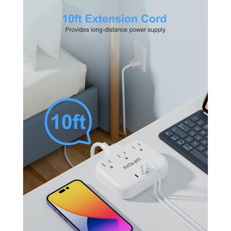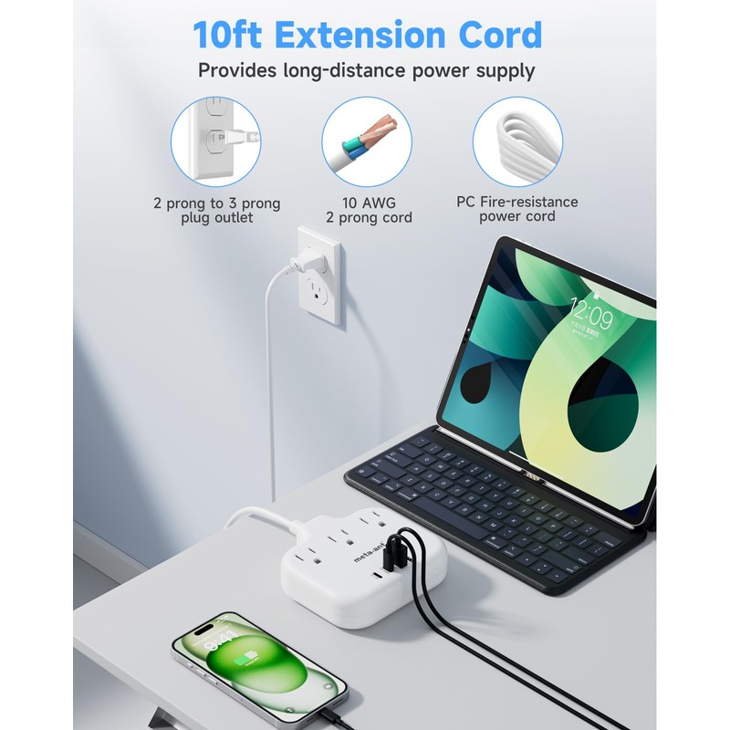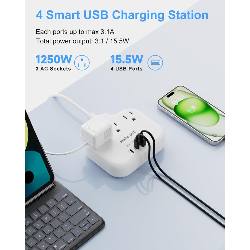 - 【15.5W Fast Charging Power Strip】meta-ant Two prong power strip with 4 AC outlets(1625W) & 4 USB ports(2 Type-C 15.5W). 2 prong to 3 prong adapter can safely charge up to 7 devices from a single ungrounded outlet, easily charge your electronics in your bedroom such as your smart phone, android device, lamp, PC, tablet WITHOUT a variety of converters