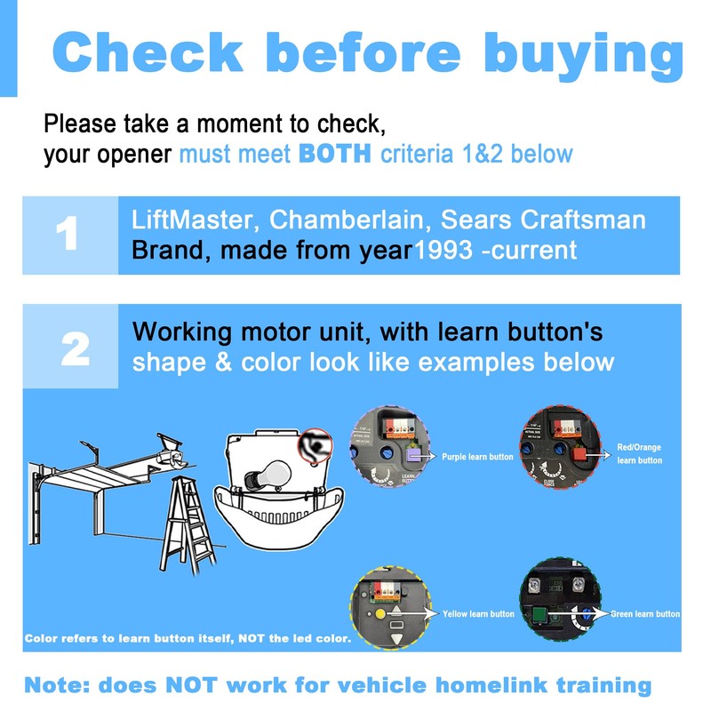 - Universal Compatibility: For Sears Craftsmanr,LiftMaster,Chamberlain garage door openers manufactured since 1993. Supports four different frequency security scroll codes. Ideal for homes with multiple vehicles or as a replacement for lost remotes.
