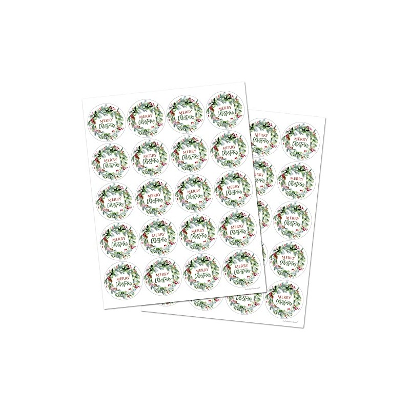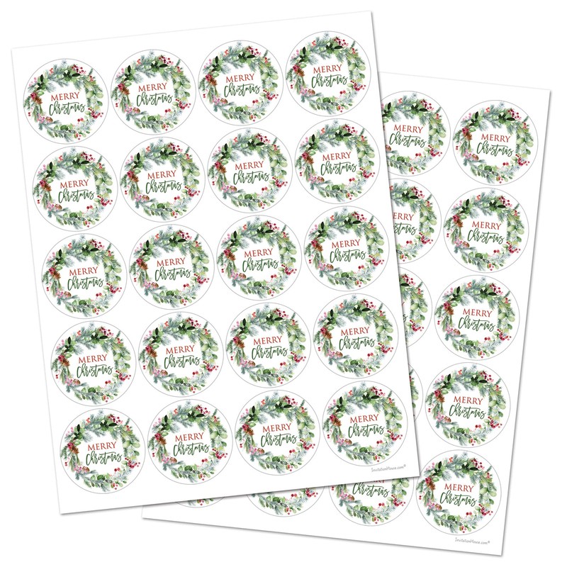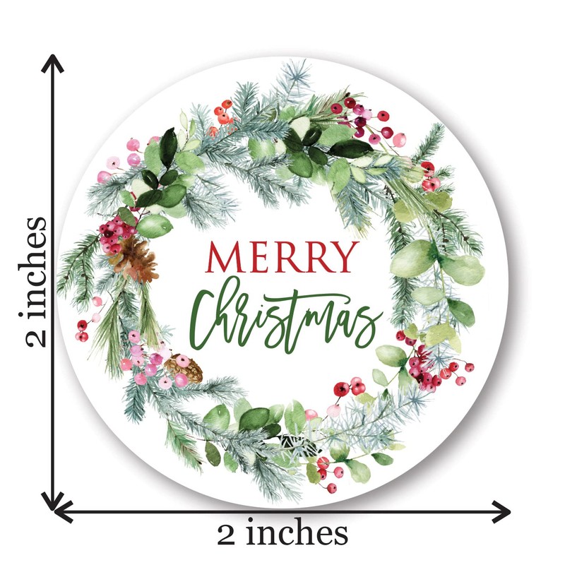 2" Round Greenery Wreath Merry Christmas Stickers (40 Labels)