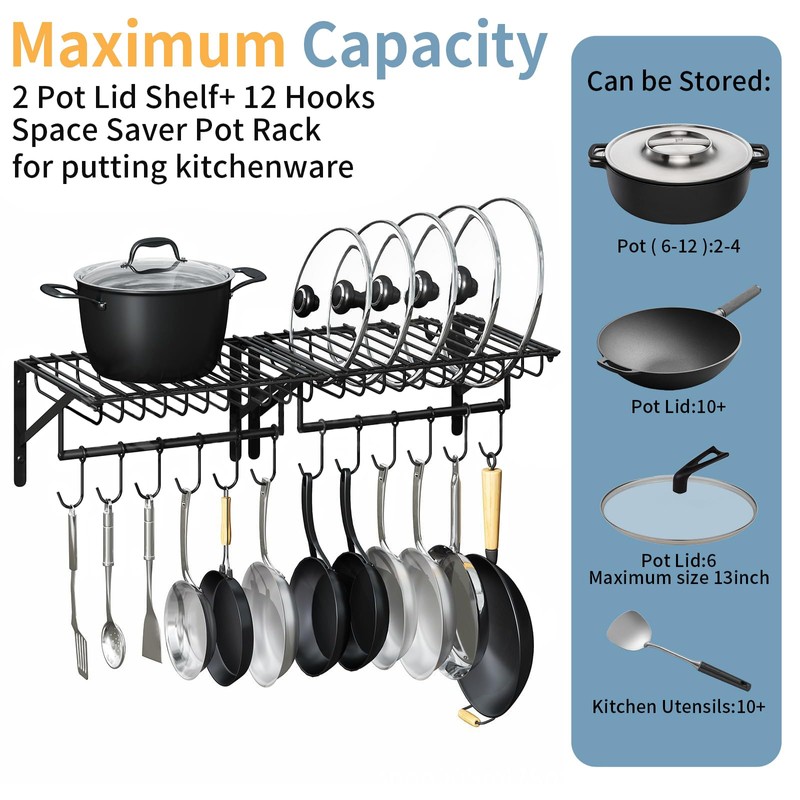 • 【Ample Capacity】 Pot hanger dimension: 15.8 inches, 12.8 inches, 6 inches, pot rack wall shelves accommodates a large amount of cooking utensils with a weight capacity of up to 80 lbs. Iron skillet, ceramic pans, pot lids can be placed on the top shelf, other kitchen necessities hangs on hooks make all cookware easily accessible