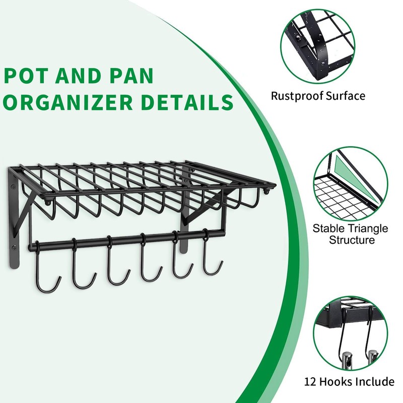 • 【Sturdy Kitchen Storage Shelf】Thick iron will not be deformed,scratch resistant,rust-proof kitchen organizer and storage. Stabilized triangular structure and 4 large screws, 4 wall anchors, pot and pan organizer can be safely hung on the wall