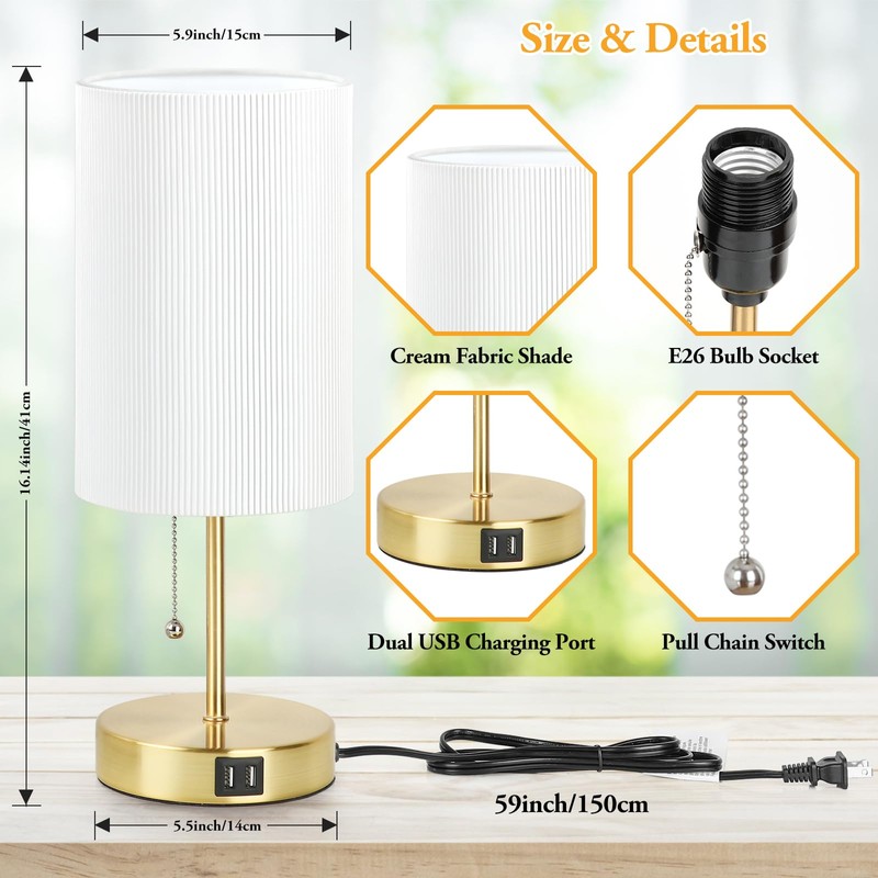 2 Sets Table Lamps with 2 USB, Minimalist Beside Lamps for Bedroom, Nightstand Lamps with Pull Chain, Desk Lamps with White Pleated Lamp Shade and Gold Metal Base for Living Room Dorm Reading Hotel
