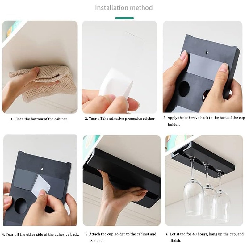 - FÁCIL DE INSTALAR Y LIMPIAR - No requiere perforación. Estos estantes de copas de vino son muy fáciles de instalar utilizando nuestra cinta de doble cara proporcionada. Puede terminar toda la instalación en minutos debajo del gabinete o estante. Estos estantes de vidrio de vino de plástico también son fáciles de limpiar y muy duraderos.