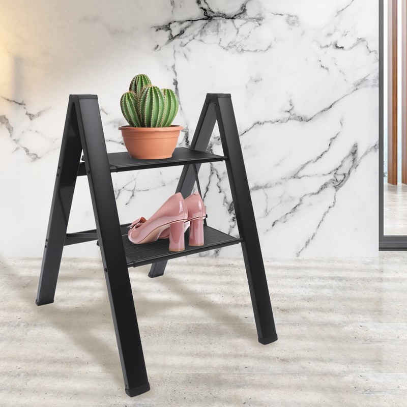- [High Load-bearing Capacity] 2 step folding step stool thickened aluminum tubes and triangular construction provide it with a maximum load capacity of 330 lbs. Its size of 6.88*12.20 inches. It is suitable for helping you to do jobs that require you to stand up high, such as changing light bulbs, changing curtains, cleaning windows, painting walls and ceilings, etc. It can also be used as a chair, planter, small step stool for children, etc