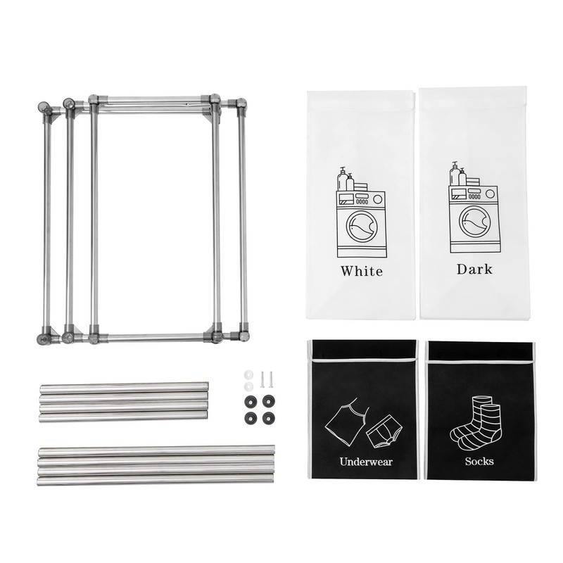 - Effectively sort clothes by color and type with 4 labeled removable canvas bags for socks, underwear, lights, and darks.