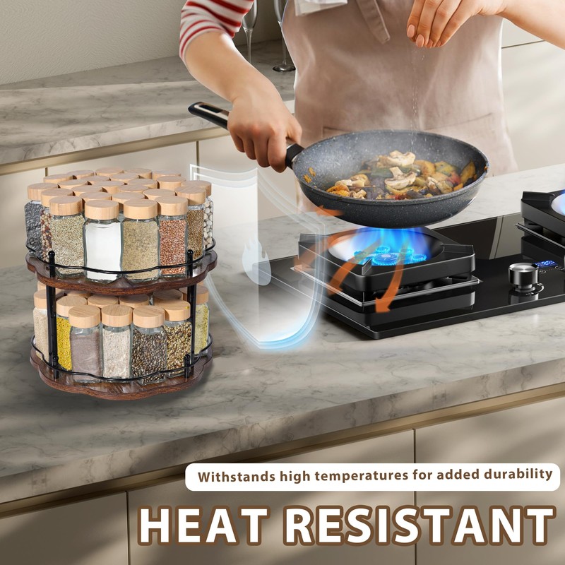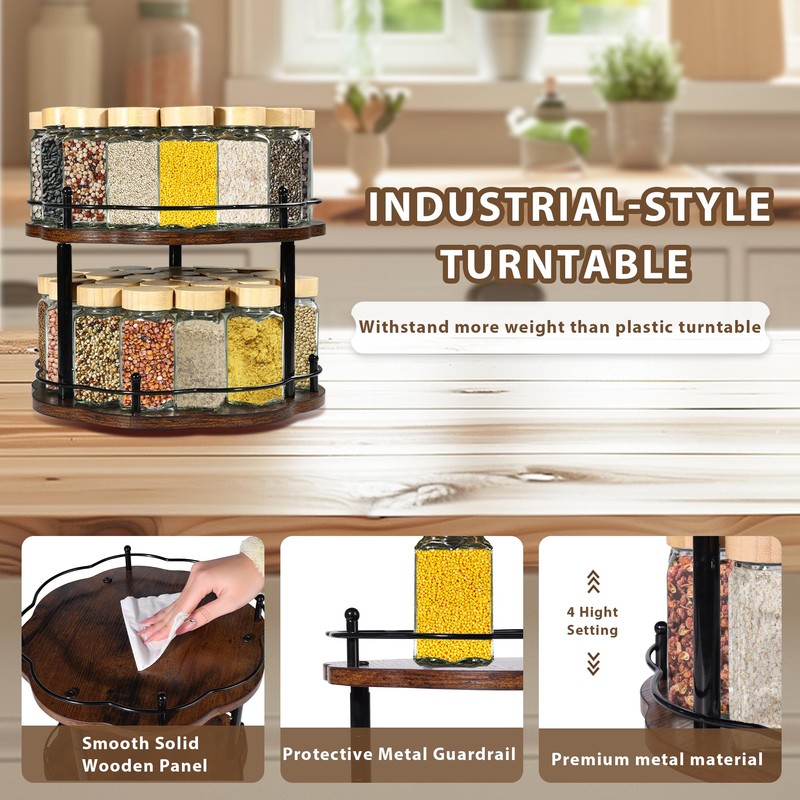• Industrial Style & Heavy-Duty Build: Add a touch of rustic charm to your kitchen with the rustic brown wood finish. Reinforced with sturdy metal, this spice rack is built to last. It spins smoothly without wobbling and can hold more weight than traditional plastic Lazy Susans. Plus, its heat-resistant design makes it safe to use near the stove.