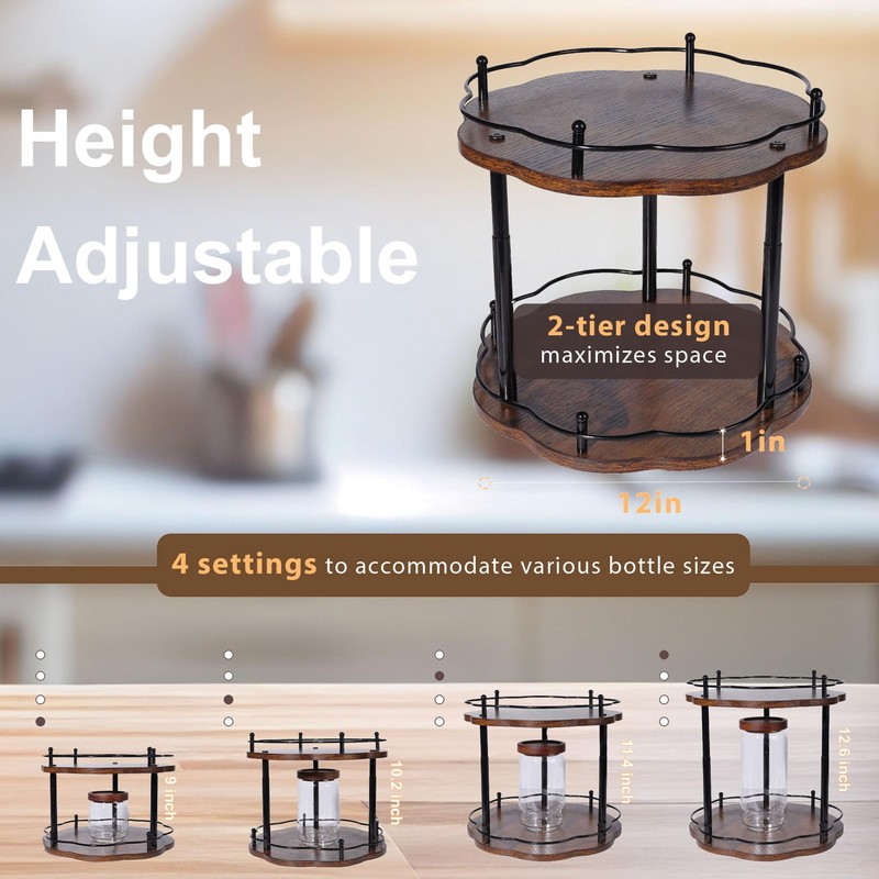 2-Tier Lazy Susan Spice Rack Organizer, Height Adjustable Rotating Turntable for Cabinet, Kitchen Countertop & Pantry, 12 Inch Wooden Spice Storage Rack, Compact & Versatile Design, Rustic Brown