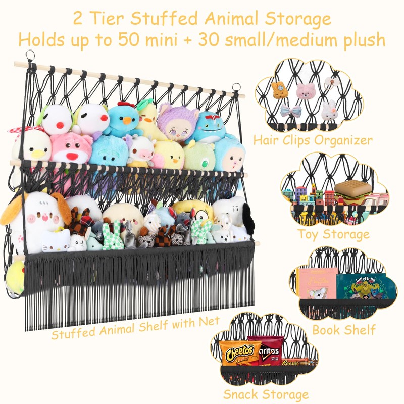 2 Tier Stuffed Animal Storage Shelf Net, 35x30'' Large Plushie Net w/ 2.4/1'' Dense Mesh for Mini Medium Stuffy Teddy, Black Boho Macrame Toy Holder Display w/ Lights&Clips for Nursery Kid Girl Boy