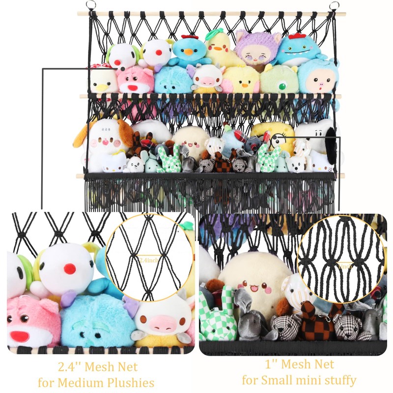 Novel Normal & Dense Mesh Net for Mini/Small Plush - The upper tier stuffed animal net features 2.4 inch normal hole for the small or medium plushes.While the last tier plushie net features 1 inch dense mesh especially for mini or small plushie, which can easily store even 3-inch plushies without dropping it.