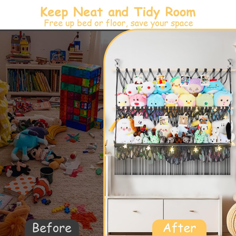 - 【Aesthetic Boho Decoration & Easy Installation】: iHansee plushies storage with bohemian tassels, is not only a stuffed animal display, but also a unique cute boho room decoration, with many colors for your choice. Together with Led star-shaped string lights to light up your plushie toys and make it a warm decoration for your room. This teddy bear holder is pre-assembled and very easy to hang up in minutes.