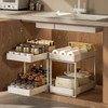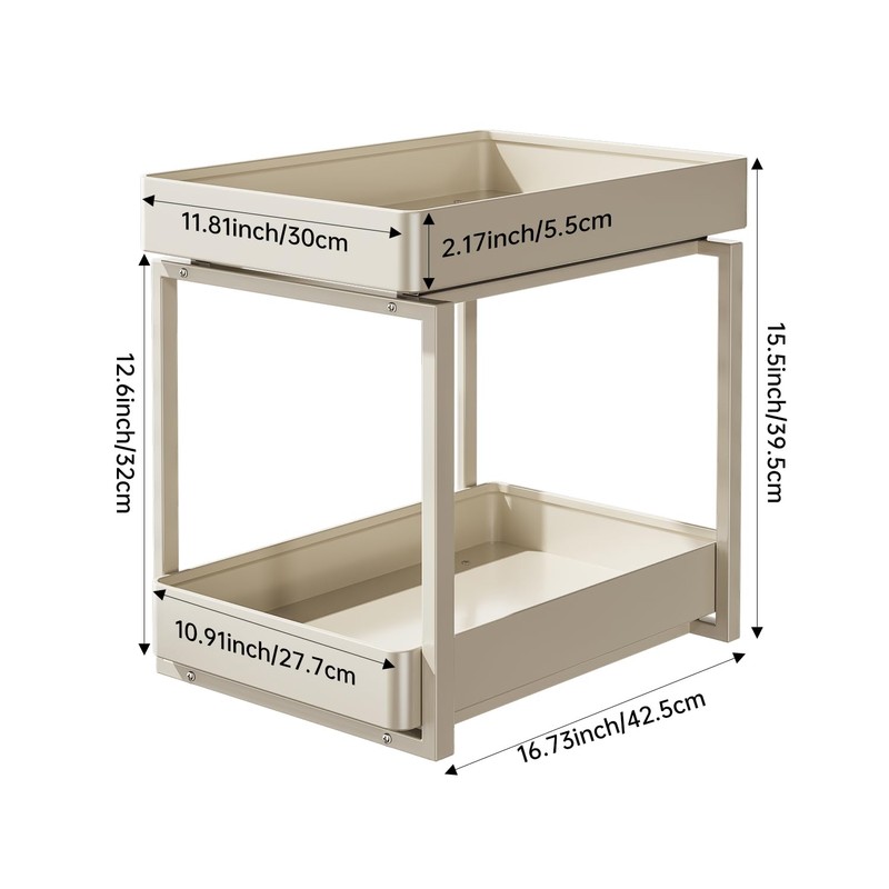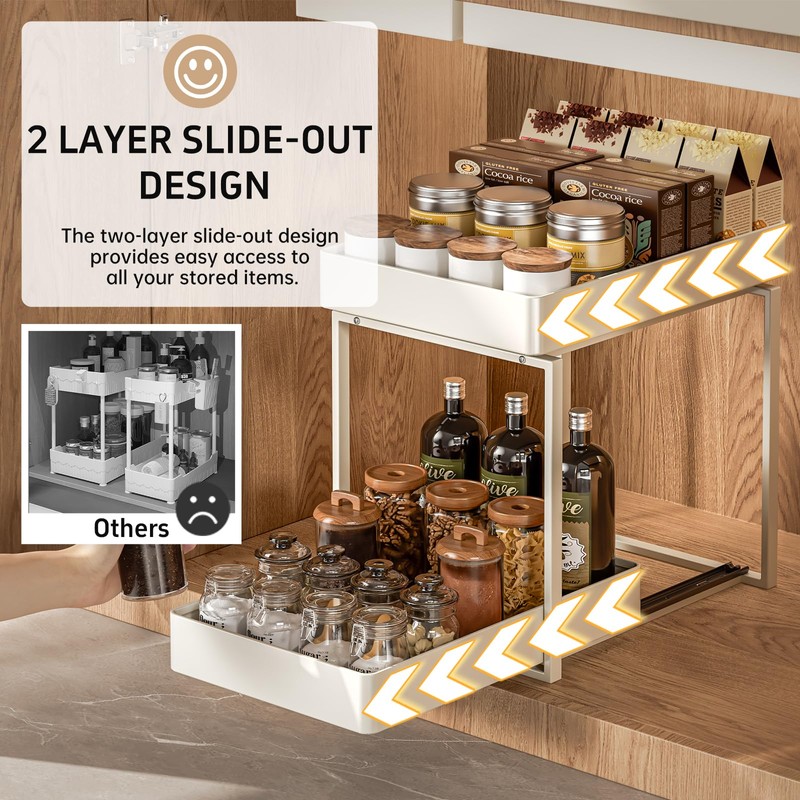 - 【2 Tier Pull Out Organizer】Unique design for under sink organizers and storage shelves, the top and bottom tiers of this 2 tier organizer slide and pull out individually, allowing you to easily access items when you reach into the cabinet under the sink. Gives you the flexibility to work around your plumbing and organize more efficiently.