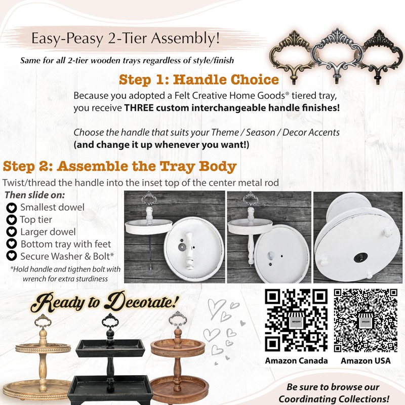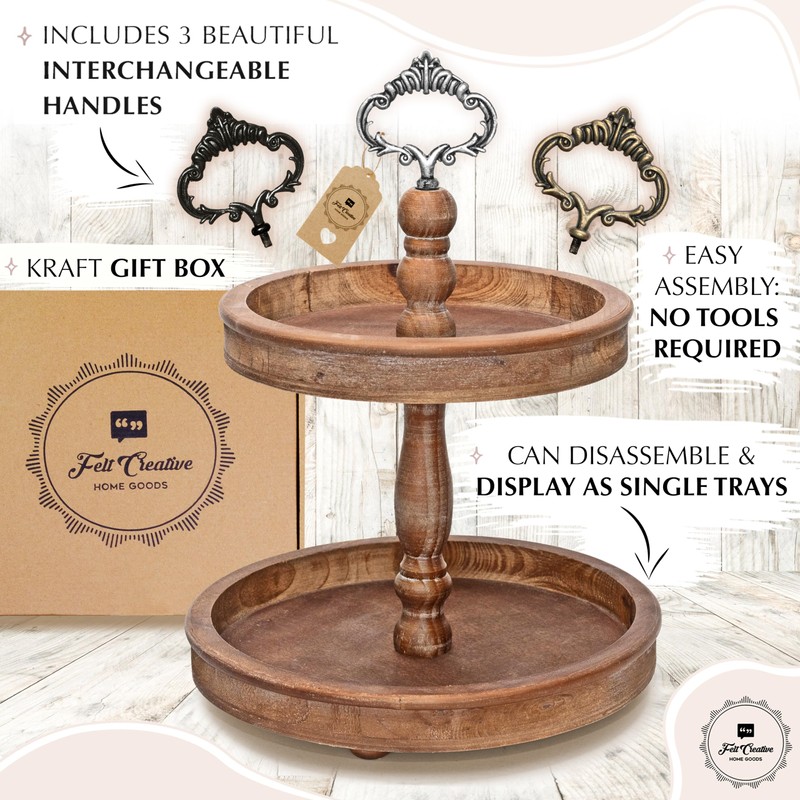- [Felt Creative Home Goods Handmade 2-Tier Tray] This two tiered wooden tray makes a stunning Coffee Table Decor and Cupcake Stand. Easy to Assemble, Store and Crafted from Top Quality Materials. Beautifully Enhances Any Kitchen or Tabletop. Patented Design from a North American Small Family Business.