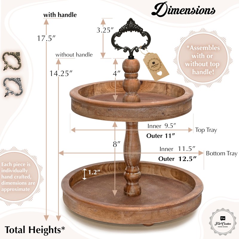 - [Two Tiered Decorative Tray] Our 2 tiered tray is easy to assemble and store, making this 2 tiered decorative tray a practical choice for your kitchen. With its beautiful design, it looks amazing as both a 2 tier dessert stand and a piece of rustic kitchen decor.