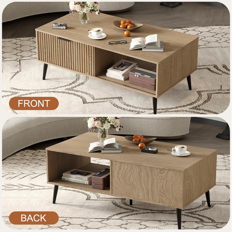 - Spacious Storage: Designed with functionality in mind, this coffee table features a generous compartment for storing books, cups, board games, and snacks, ensuring a clutter-free surface. ripple -patterned drawer door adds a charming farmhouse appeal while maintaining practical utility. The expansive tabletop measures 41.34''D x 21.65''W x 16.34''H, providing ample space to showcase decorative items and withstands a total weight of up to 80 lbs.
