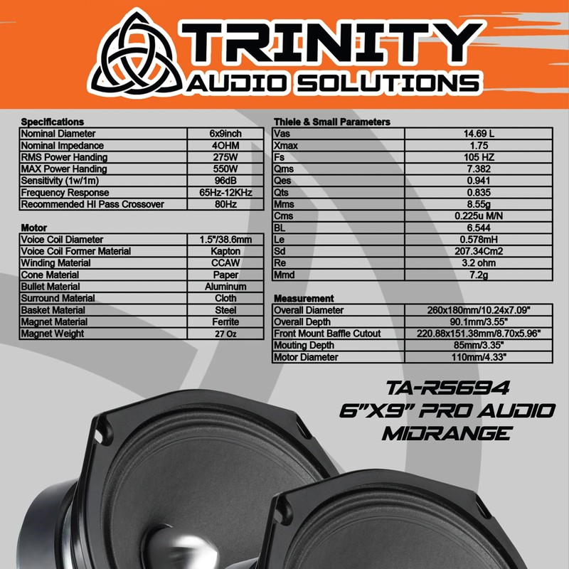 - With a workable slim-lined design, the RS694 pro audio midrange speaker fits in spaces where many other bulky 6"x9" speakers may not. And with a customary 4 ohm impedance, they work with almost any musical application.