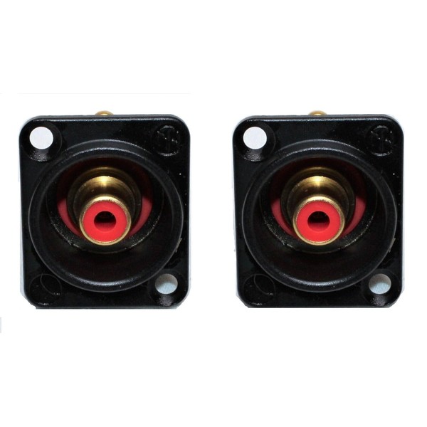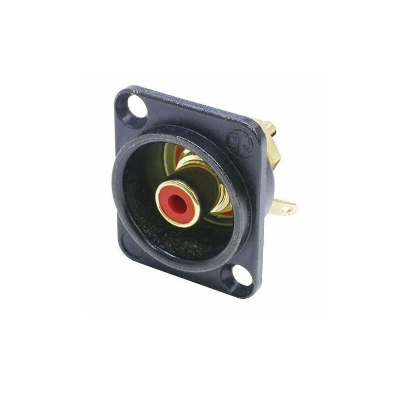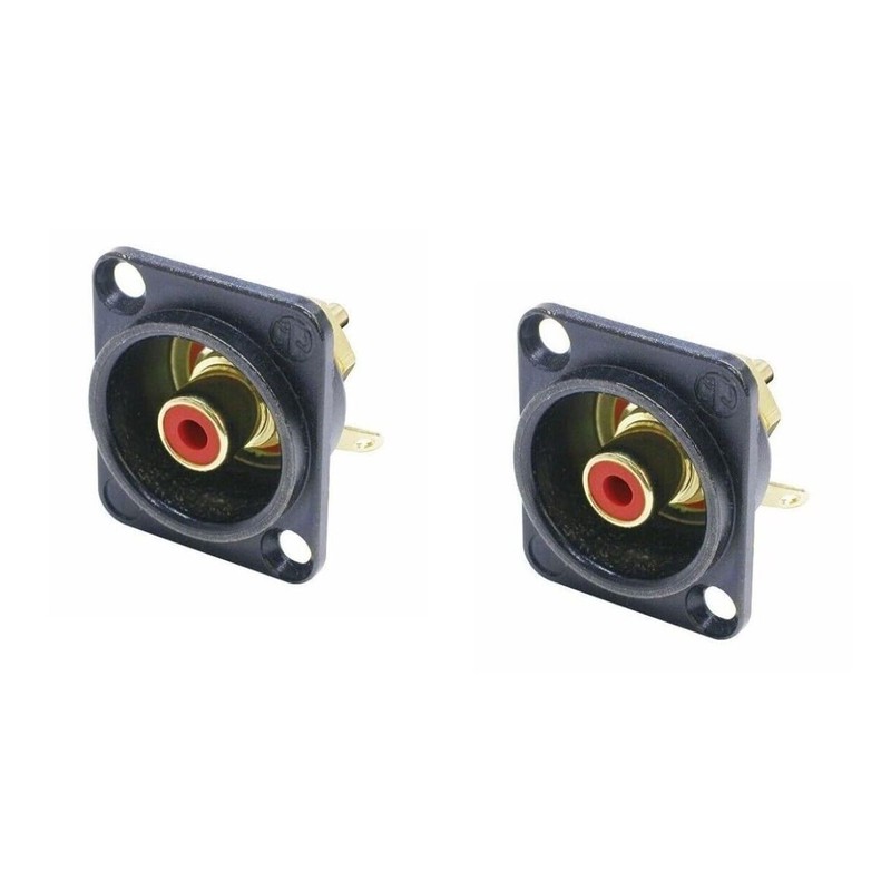 (2) Two Original NEUTRIK NF2D-B-2 RCA Panel Mount Female Jack RED Isolation Washer Gold Plated Contacts Neutrik NF2D-B-2 RCA Female Jack D-Series Red This panel mount RCA connector adheres to Neutrik's industry-standard D-style and can be front or back-mounted. It is equipped with red isolation washers for easy identification. Specifications: Shell: zinc diecast Contact plating: gold Sold per: each Finish: black Termination style: solder Mounting hole: 0.78'' Rated current per contact: 16 A Rated voltage: 50 V Capacitance between contacts: 9 pF Contact resistance: <5G mO Dielectric strength: 0.5 kV DC Insulation resistance: < 5 GO Dimensions: 0.543'' x 2.445''