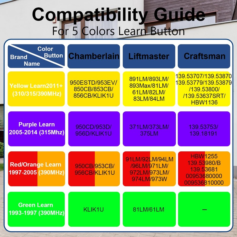 - Widely Compatible: Works on LiftMaster, Chamberlain and Craftsman garage door openers has a Red/Orange/Purple/Yellow learn button manufactured from 1993 to current, compatible with two different frequency safety scroll codes. Whether you're part of a multi-car family or need a replacement for lost or damaged remotes, our solution ensures hassle-free operation.