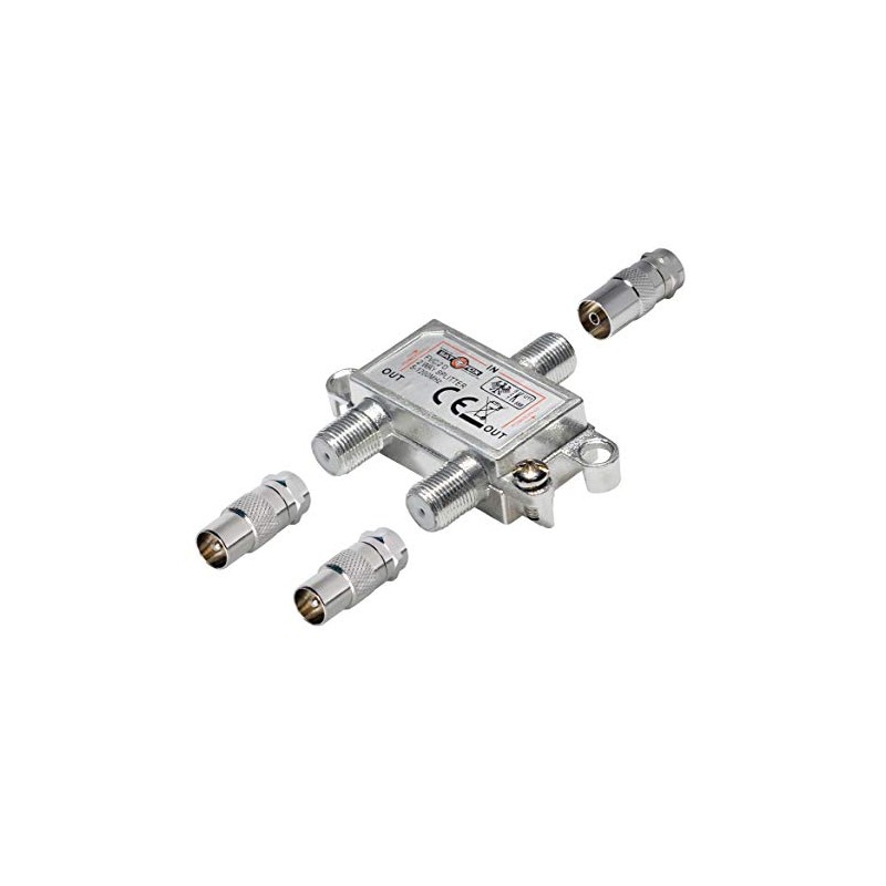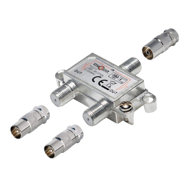 - Box contents: 1x 2-way splitter with 2x adapters F-plug - coaxial plug 9.5 mm 1x F-plug - coaxial socket 9.5 mm, nickel-plated