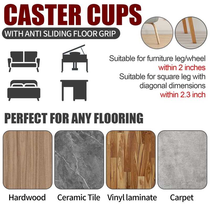 - PROTECTS ALL FLOORING: Our anti skid caster cups are suitable for use on any type of flooring, including hardwood, linoleum, rugs, ceramic tile, vinyl, carpet, cement,wood, glass and laminate floors.