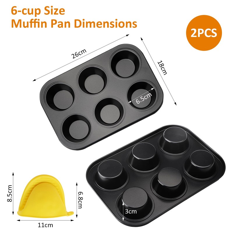 - Specifications of Muffin Pan Set:2pcs carbon steel muffin tray 6pcs, 26.5*18.5*3cm muffin baking pan, cupcake 6.5*6.5*3cm. Muffin moulds ideal for cupcakes, brownies, cakes, pudding
