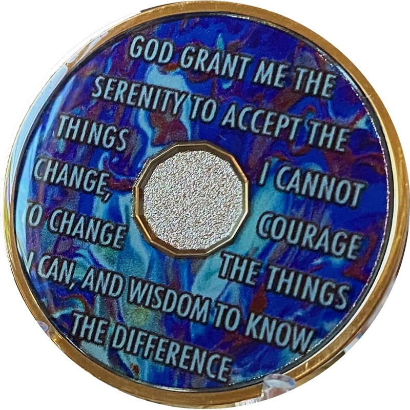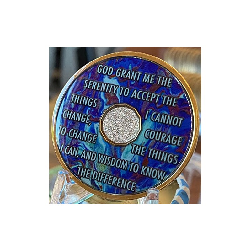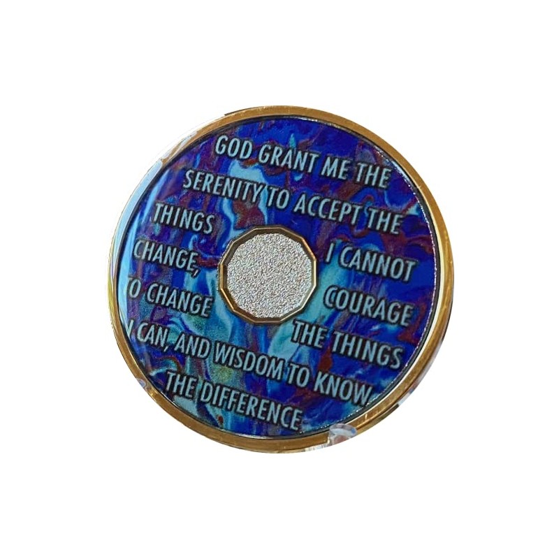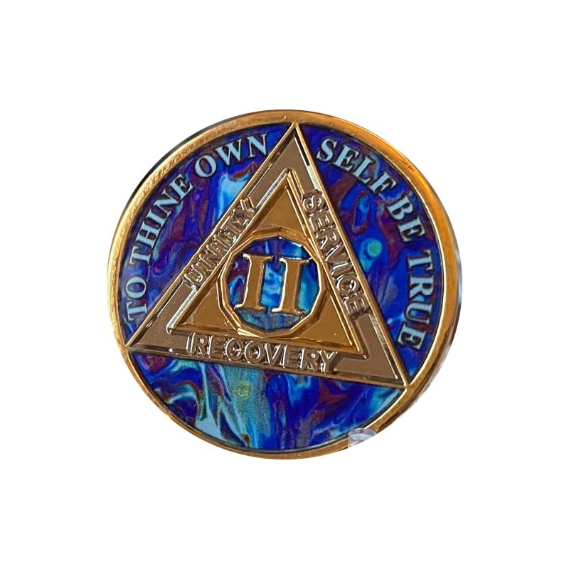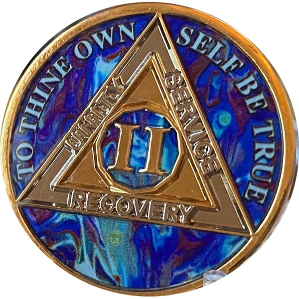 Premium quality 2 Year AA Sobriety Medallion in Sapphire Blue Swirl Design With Gold Plating. Glass Like Epoxy Dome. Serenity Prayer on the back It really feels like a premium coin yet isn't heavy in your pocket. Great gift for members of Alcoholics Anonymous