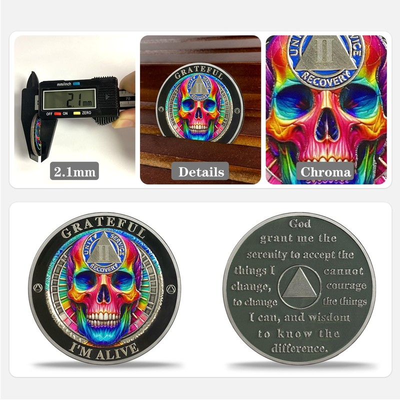 2 Year AA Sobriety Coin – Colorful Skull Recovery Token with Serenity Prayer – I'm Alive Medallion – Unity Service Recovery 12 Step Chip – Inspirational Milestone Gift