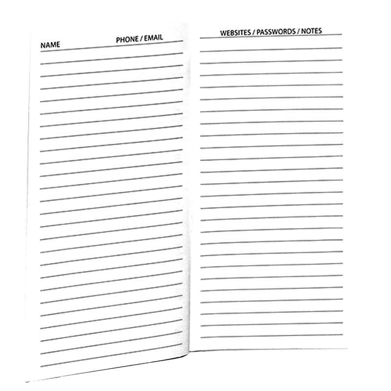 Handcrafted Checkbook Size 3" by 6" Planner with January through December Calendar insert with design inside a quality 12 Gauge vinyl cover. 30 Page notepad included. Not a leather cover. Front page dedicated to lines for Personal Information, In Case Of Emergency information, and Medical information. Last three pages are dedicated to lines for Important phone numbers / emails, websites / passwords/ notes, and birthdays / anniversaries. Made in the USA.