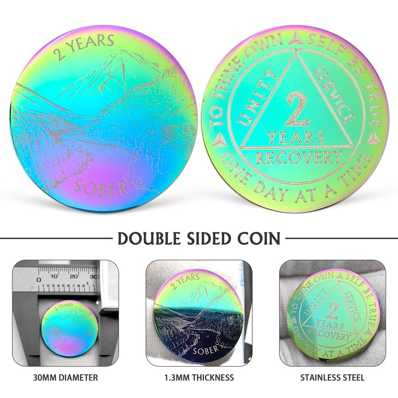 - Premium Quality Material: This 2 year sobriety chip is crafted from durable metal with a colorful finish. Exquisite rainbow style, beautiful and strong. Every recovery coin come with PU leather keychain and organza gift bag