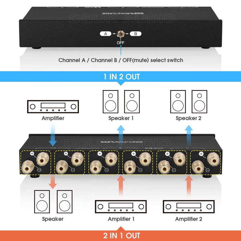 • 2-way amplifier / speaker selector switch: both working modes (2-in-1-out / 1-in-2-out), with A/B channel toggle switch, convenient to compare the sound quality of 2 pairs of different speakers or 2 pieces power amplifier, without repeatedly plugging in and unplugging cables to avoid the contact point of the sockets.