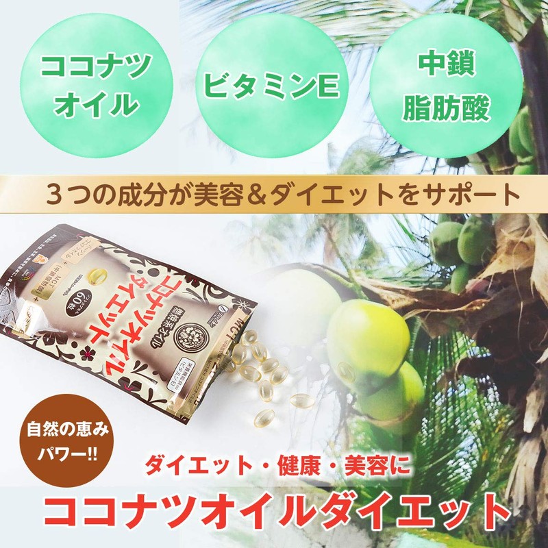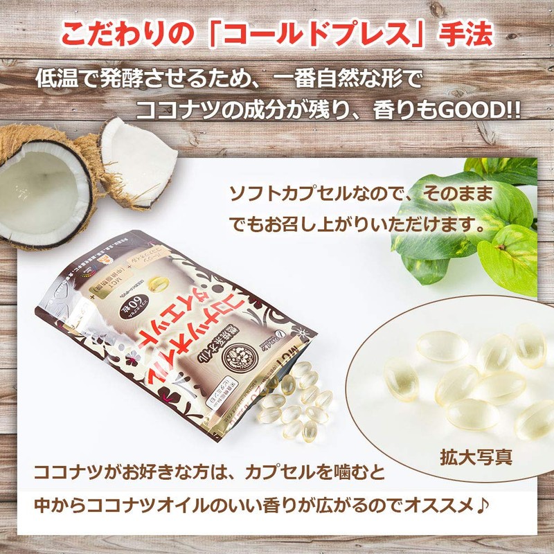 - 【原材料】中鎖脂肪酸油、食用やし油、ゼラチン、グリセリン、ビタミンE(原材料の一部に大豆を含む)