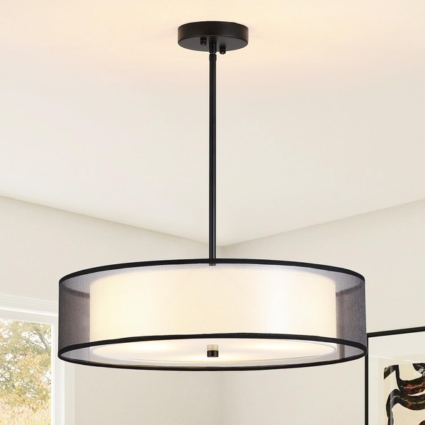 - Elegant Dual-Layer Design: Crafted from sturdy metal and a chic double-layer fabric shade, this dining room chandelier blends a translucent black mesh outer layer with a soft white inner drum. Classic yet elegant, ideal for modern, industrial, farmhouse, or traditional styles
